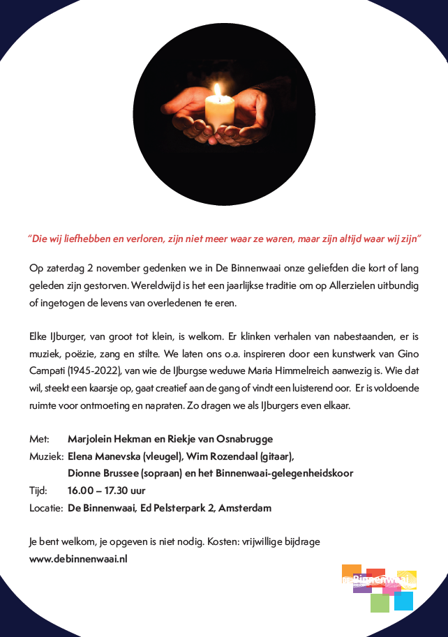 | 2 november - Allerzielenviering in de Binnenwaai, Ed Pelsterpark 2 in Amsterdam Noord - Muziek: Dionne Brussee - sopraan, Elena Manevska - piano, Wim Rozendaal, gitaar. zie link: https://debinnenwaai.nl/activiteiten-menu/allerzielen |